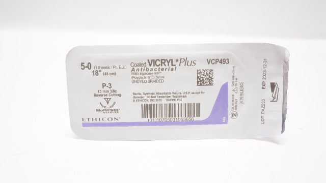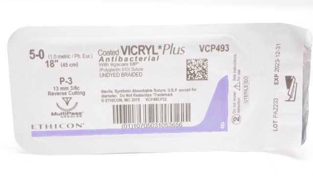 - Ethicon VCP493 5-0 VICRYL Plus, P-3, 13mm 3/8c Reverse Cutting, 18inch (x)