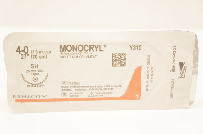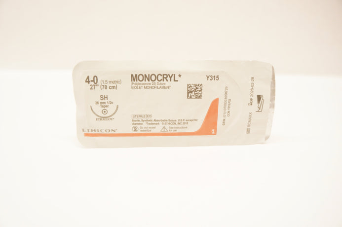 - Ethicon Y315 4-0 MONOCRYL Poliglecaprone 25 Stre SH 26mm 1/2c Taper, 27inch