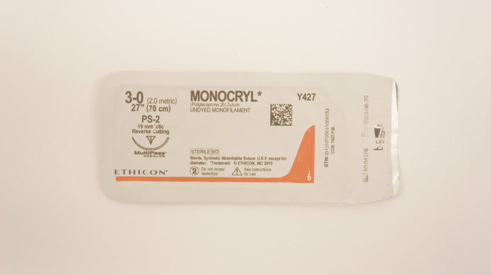 Ethicon Y427 3-0 Monocryl Stre Undyed PS-2 19mm 3/8c Reverse Cutting, 27inch