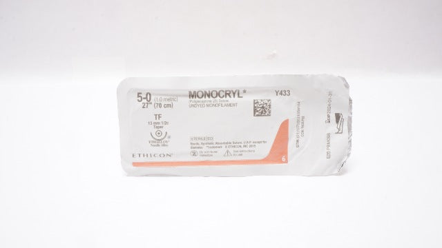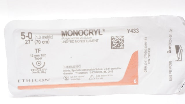 - Ethicon Y433 5-0 MONOCRYL Undyed Monofilament, TF, 13mm 1/2c Taper, 27inch