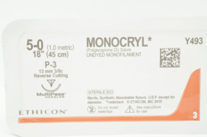 - Ethicon Y493 5-0 MONOCRYL Undyed Monofilament P-3 13mm 3/8c Reverse Cutting,18in