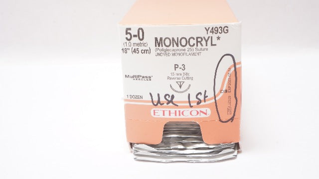 - Ethicon Y493G 5-0 MONOCRYL, P-3, 13mm 3/8c Reverse Cutting, 18inch (x)-Box of 11