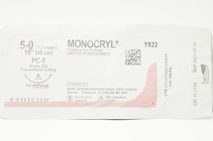 - Ethicon Y822 5-0 MONOCRYL PC-5 19mm 3/8c Conventional Cutting, 18inch (x)