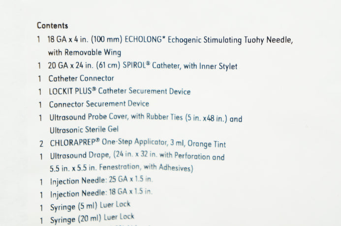 1- Cath. Connector, 1- LOCKIT PLUS Cath. Securement Device, 1- Connector Securement Device, 1 -Ultrasound Probe Cover, w/ Rubber Ties (5in.x 48in.) and Ultrasonic Sterile Gel, 2- CHLORAPREP One-Step Applicator, 3 ml. Orange Tint, 1- Ultrasound Drape, (24 in. x 32 in. w/ Perforation and 5.5in. x 5.5in. Fenestration, w/ Adhesives), 1- Injection Needle: 25GA x 1.5 in., 1 - Injection Needle: 18GA x 1.5 in., 1- Syringe (5 ml.) Luer Lock, 1- Syringe (20 ml.) Luer Lock, 1- 5 ml. Ampule HCl, 1% Lidocaine, 1 -Injection Extension Set, 24in., 1- Extension Tubing Set, 6in., 1- Benzoin (2/3 ml vial), 2 -TEGADERM Dressings (4in. x 5in.), 2- STERI-STRIP, card of 3, 8 -Gauze Pads (4 in x 4 in.), 1- 5 Micron Straw Filter, 1- Needle Stick/Needle Disposal Pad, 1- Medication ID Label, 1- Cath. Site Label