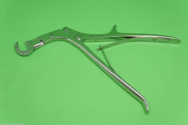 Special features: proximal end permanently pleated and at a right angle to the handle; crescent shape distal end to facilitate guillotine action of bade on rib