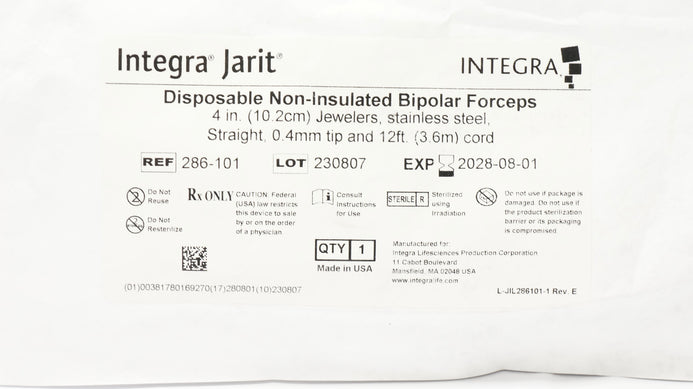 - Integra 286-101 Jarit Bipolar Forceps 4inch Jewelers 0.4mm Tip 12Ft. Cord