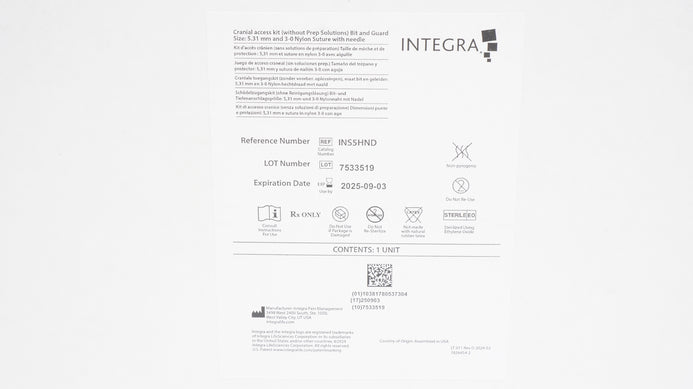 - Integra INS5HND Cranial Access Kit Bit & Guard 5.31mm & 3-0 Nylon Stre w/Ndle(x)