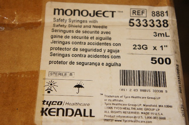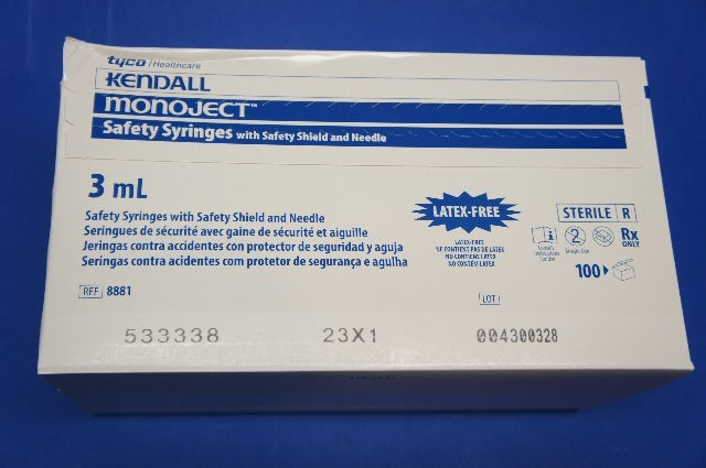- Kendall 8881 Monoject Safety Syringes 3mL 23G x 1 ~ Box of 500