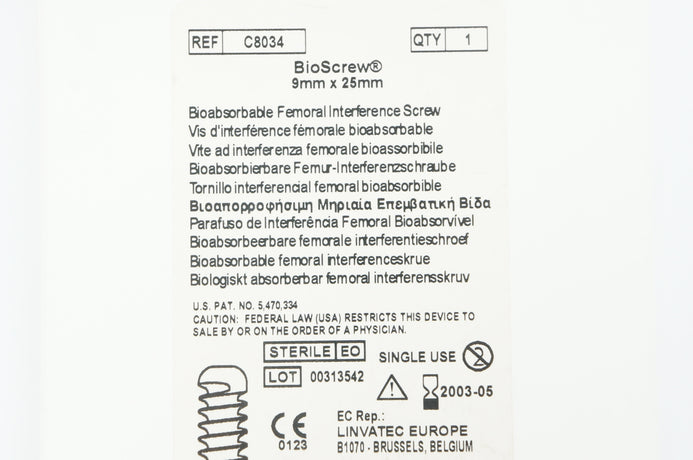 Linvatec C8034 Bioabsorbable Femoral Interference Screw 9 x 25mm (x)