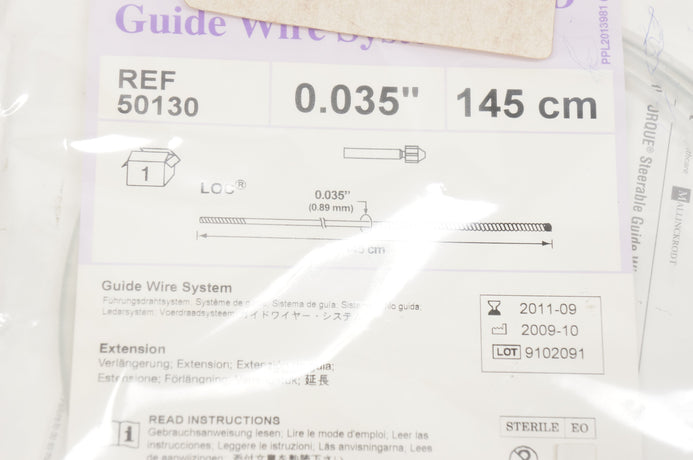The Mallinckrodt 50130 Guide Wire System is a medical device used in interventional radiology and other medical procedures to guide catheters and other instruments through the body's vascular system. The guide wire has a diameter of 0.035 inches and a length of 145cm, providing ample length and flexibility for a range of procedures.