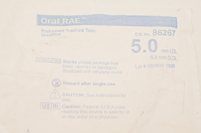 - Mallinckrodt 86267 Oral RAE Preformed Tracheal Tube Uncuffed 5mm ID