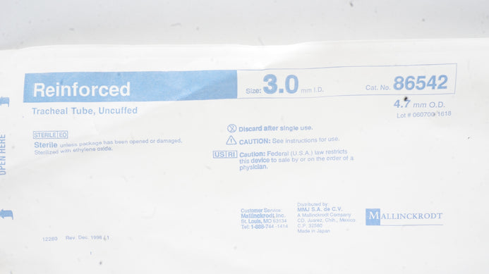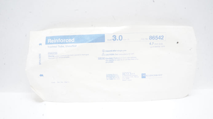 - Mallinckrodt 86542 Reinforced Tracheal Tube, Uncuffed 3.0mm I.D. x 4.7mm O.D.