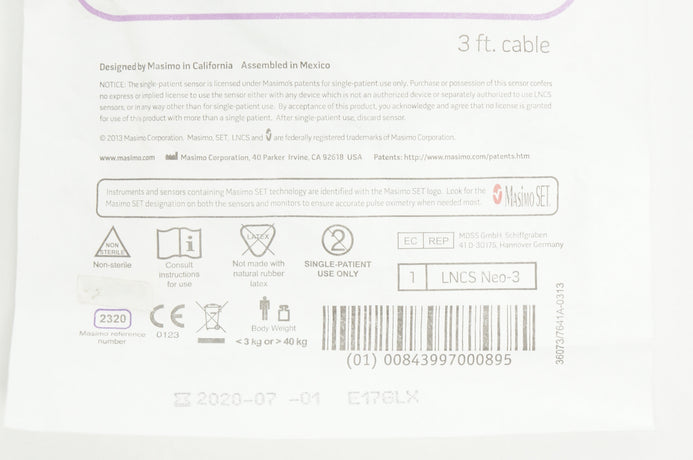 - Masimo LNCS Neo-3 SpO2 Neonatal/Adult Pulse Oximeter Adhesive Sensor (x)
