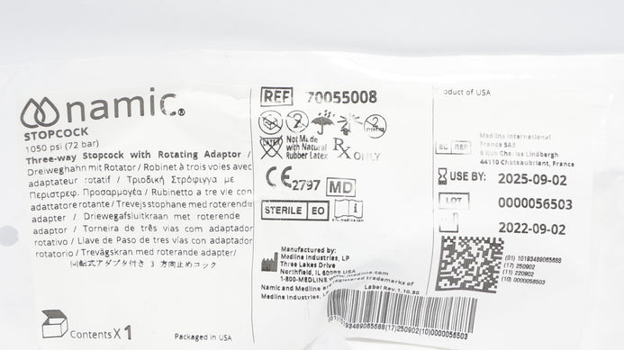 - Medline 70055008 Namic Three-Way Stopcock w/Rotating Adaptor 1050psi (x)