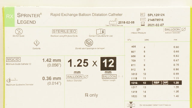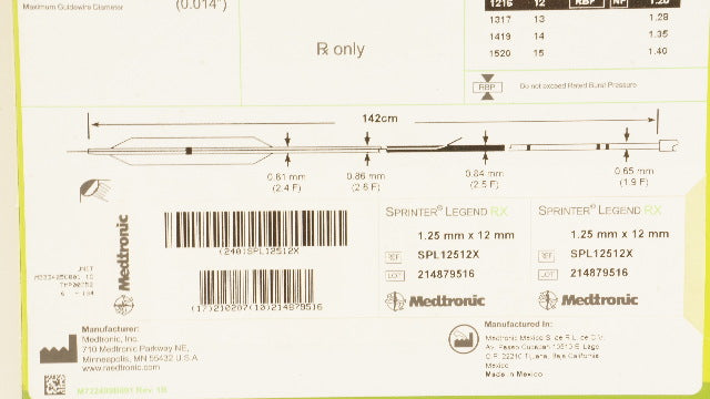 Medtronic SPL12512X Sprinter Legent Rapid Exchange Balloon Dilatatiuon Catheter 1.25 x 12mm