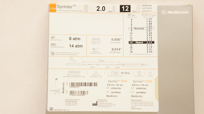 - Medtronic SPR2012W Sprinter OTW Balloon Dilatation Cath. 2.0mm x 12mm