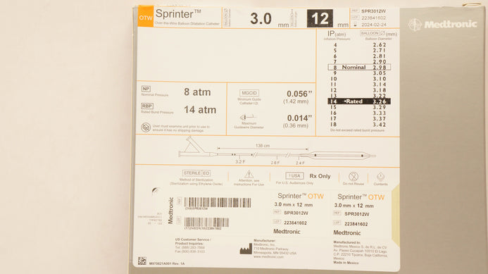 - Medtronic SPR3012W Sprinter OTW Balloon Dilatation Cath. 3.0mm x 12mm