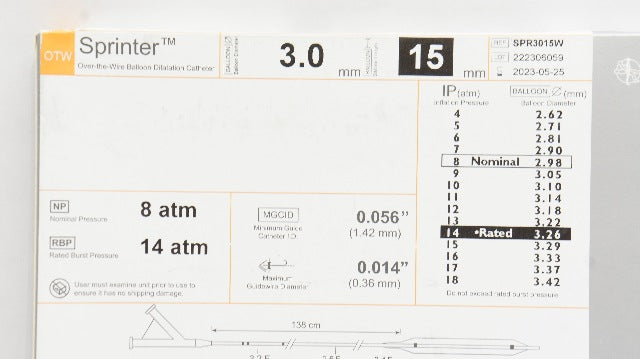 Medtronic SPR3015W Sprinter OTW Balloon Dilatation Cath. 3.0mm x 15mm