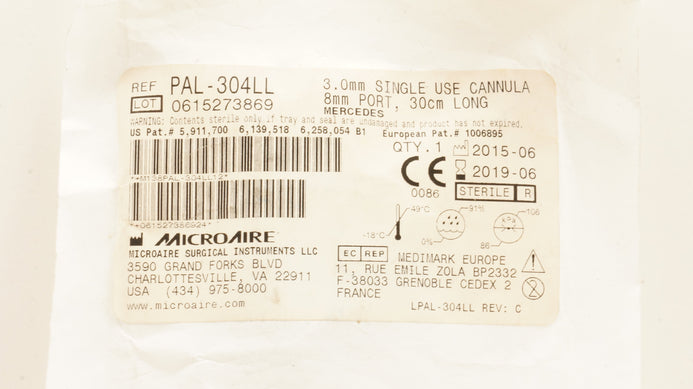 Microaire PAL-304LL 3.0mm Single Use Cannula 8mm Port  30cm Long