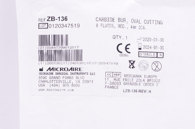- MicroAire ZB-136 Carbide Bur, Oval Cutting 8 Flutes, Med, Diameter 4mm