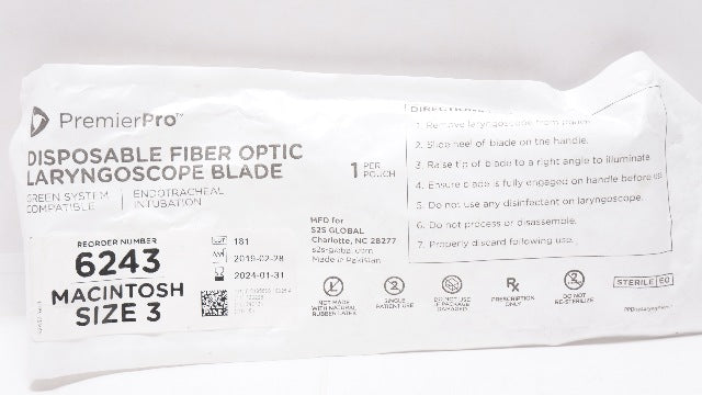 PremierPro 6243 Disposable Fiber Optic Laryngoscope Blade Size 3