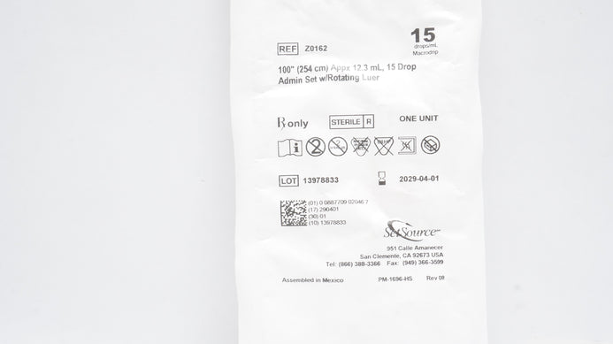 - SetSource Z0162 Administration Set w/Luer 100inch x 12.3ml Appx. 15Drop/mL