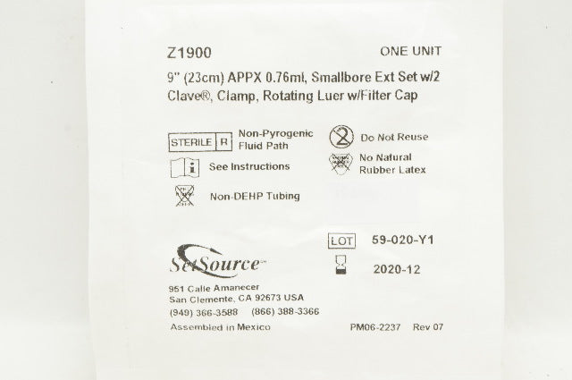 - SetSource Z1900 APPX 0.76mL, Smallbore Ext Set W/2 Clave, Clamp, 9inch (x)