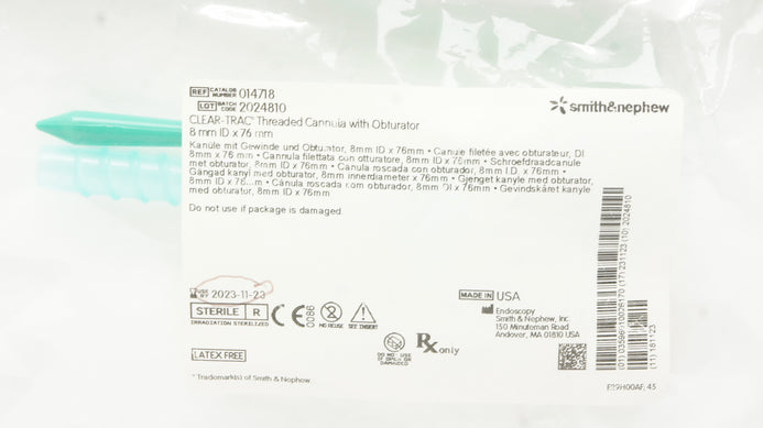- Smith&Nephew 014718 CLEAR-TRAC Threaded Cannula with Obturator 8mm ID x 76mm (x)
