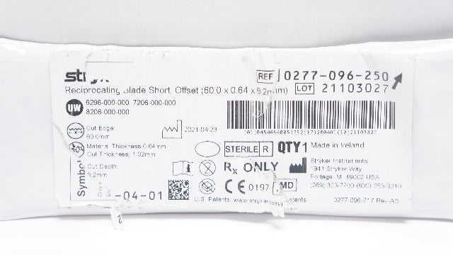Stryker 0277-096-250 Reciprocating Blade Short, Offset 60.0 x 0.64 x 6.2mm