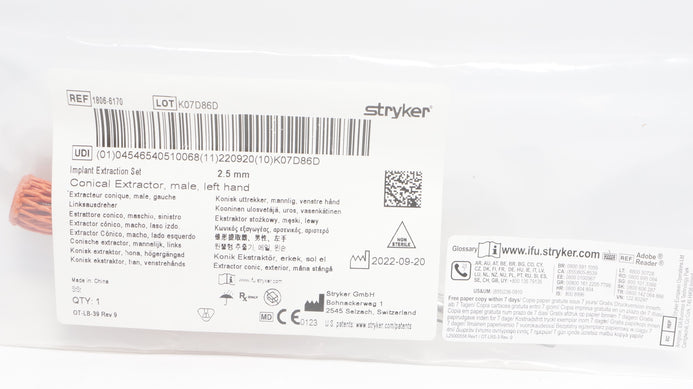 - Stryker 1806-6170 Implant Extraction Set,Conical Extractor,Male, Left Hand 2,5mm