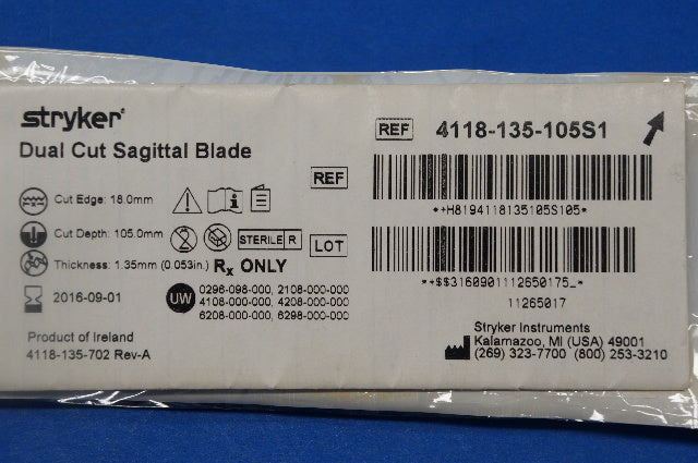 Stryker 4118-135-105S1 Dual Cut Sagittal Blade 18.0mm x 105mm x 1.35mm