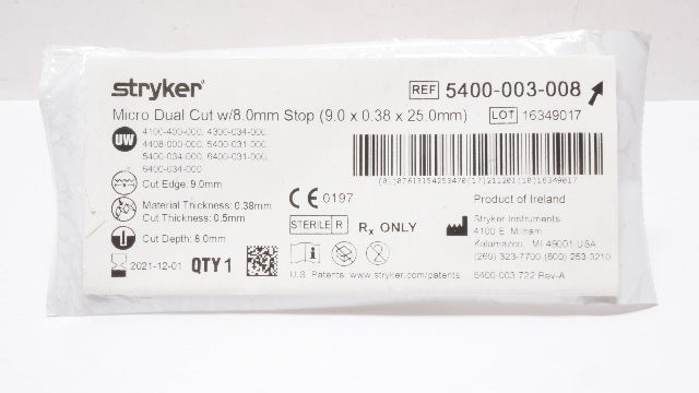 - Stryker 5400-003-008 Micro Dual Cut w/8.0mm Stop 9.0 x 0.38 x 25.0mm (x)