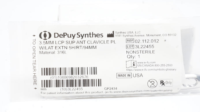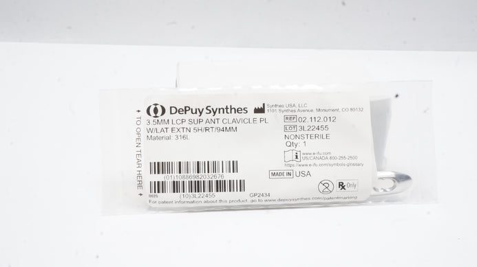 - Synthes 02.112.012 3.5mm LCP SUP ANT Clavicle Plate w/Lat Extn 5H/RT/94mm