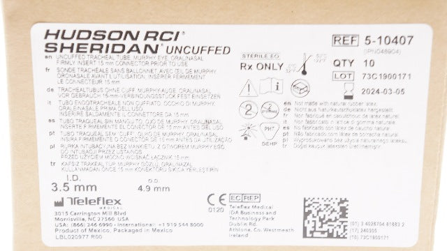 - Teleflex 5-10407 Hudson RCI Sheridan Tracheal Tube 3.5ID x 4.9mmOD - Box of 10