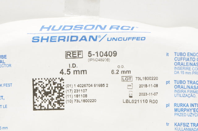 - Teleflex 5-10409 Hudson RCI Sheridan Uncuffed Tracheal Tube 4.5mm ID x 6.2mm OD