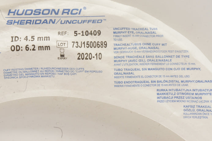 - Teleflex 5-10409 Hudson RCI Sheridan Uncuffed Tracheal Tube 4.5mm x 6.2mm (x)