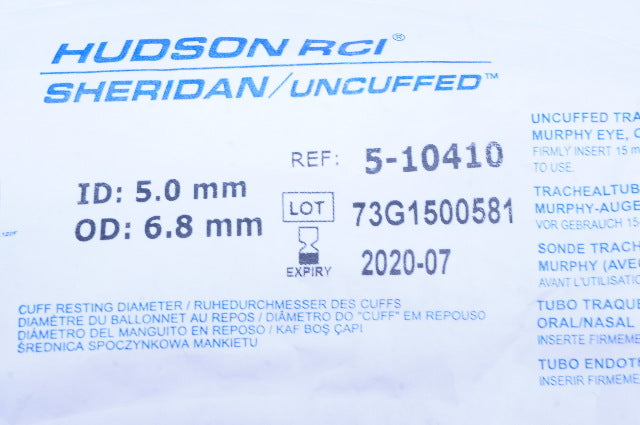 Teleflex 5-10410 Hudson RCI Sheridan Uncuffed Tracheal Tube 5.0 ID x 6.8mm OD(x)