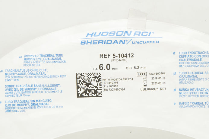 - Teleflex 5-10412 Hudson RCI Sheridan Uncuffed Tracheal Tube 6.0 ID x 8.2mm OD(x)