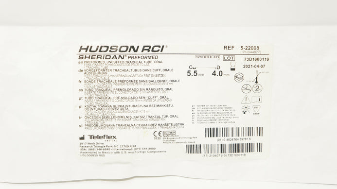 Teleflex 5-22008 Hudson RCI Preformed Uncuffed Tracheal Tube 4.0ID x 5.5mmOD (x)