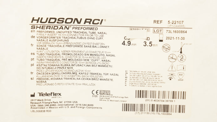 - Teleflex 5-22107 Hudson RCI Preformed Uncuffed Tracheal Tube 3.5 ID x 4.9mmOD(x)
