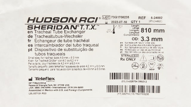 - Teleflex 5-24002 Hudson RCI Sheridan T.T.X.Tracheal Tube Exchanger L- 810mm (x)