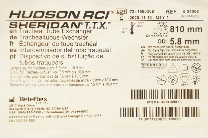 Teleflex 5-24006 Hudson RCI Sheridan T.T.X. Tracheal Tube Exchanger 810x5.8mm(x)
