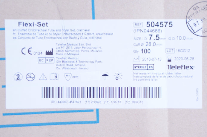 Teleflex 504575 Flexi-Set Endotracheal Tube & Stylet 7.5x10.0x28.0mm -Case of100
