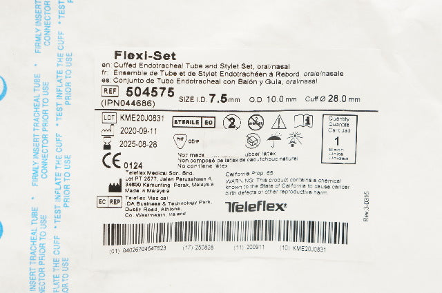 - Teleflex 504575 Flexi-Set Endotracheal Tube & Stylet Set 7.5ID x 10.0OD x 28.0mm