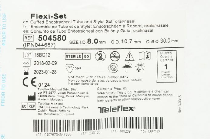 Teleflex 504580 Flexi-Set Cuffed Endotracheal Tube 8.0mm x 10.7mm x 30.0mm