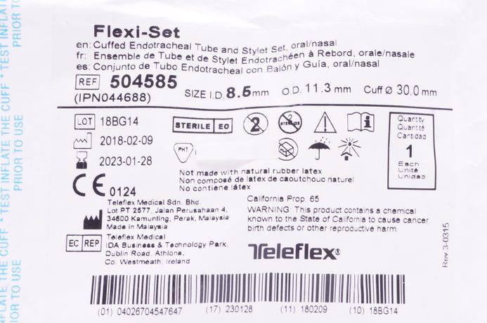 - Teleflex 504585 Flexi-Set Endotracheal Tube & Stylet Set 8.5ID x 11.3OD x 30.0mm