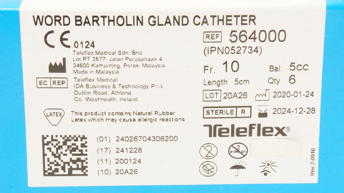 Teleflex 564000 Word Bartholin Gland Cath. 10Fr x 5cm, 5cc - Box of 6