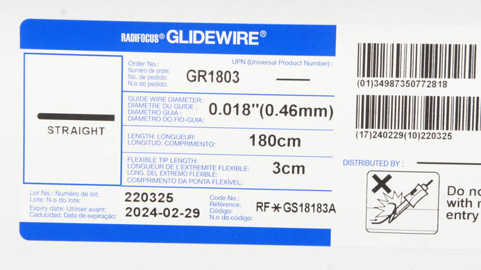 - Terumo GS18183A Radifocus Glidewire Straight, 0.018in x 180cm x 3cm-Box of 5 (x)