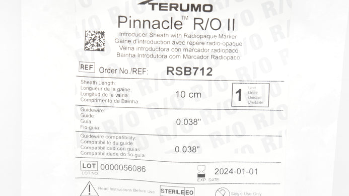 - Terumo RSB712 Pinnacle R/O II Introducer Sheath 10cm x 0.038In x 0.038In (x)