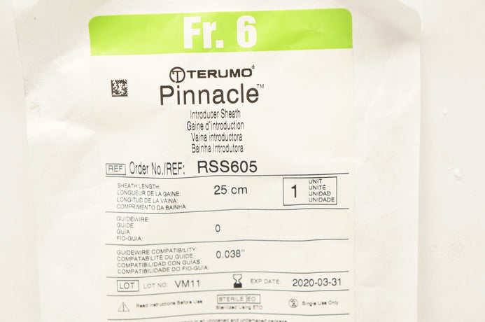 - Terumo RSS605 Pinnacle Introducer Sheath Fr. 6, 25 cm x 0.038 inch (x)
